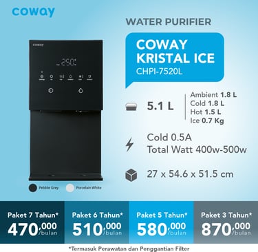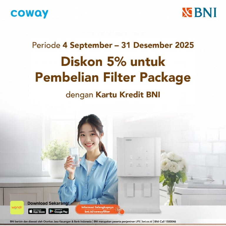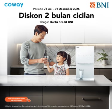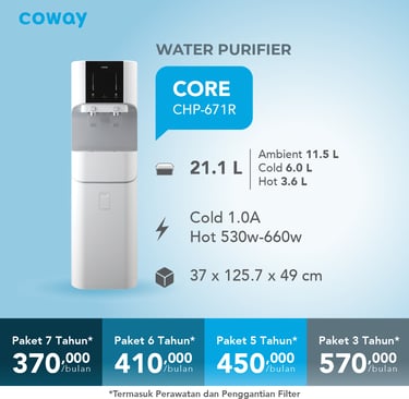 Water Purifier Coway mengubah air keran di rumah Anda menjadi Air Minum berkualitas tinggi (Bebas BPA, Bebas Mikroplastik, Bebas Bakteri, Bebas Klorin dan TDS rendah) dan rasa yang segar dengan hasil air minum tanpa batas.