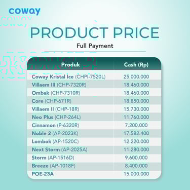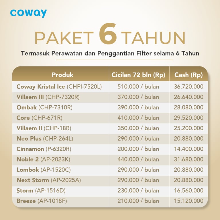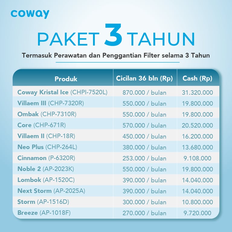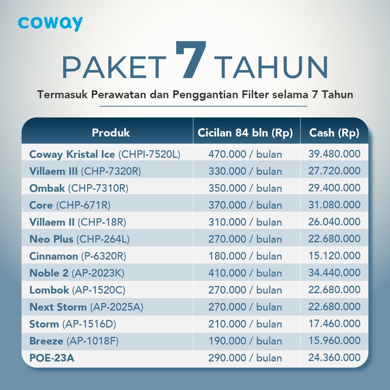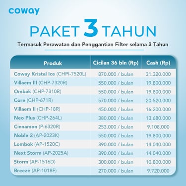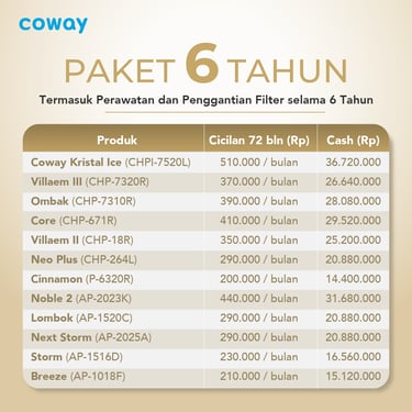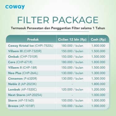 Paket langganan Water Purifier & Air Purifier dari Coway sudah termasuk Free Service per 2 bulan sekali, pergantian filter sesuai umur filter/periodik serta Garansi Produk mengikuti paket yang anda pilih.